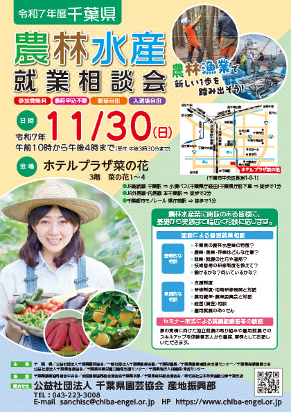 (公社)千葉県園芸協会は、千葉県における農業経営・就農支援センターの一員として、千葉県で農業を始めたい人に向けた就農相談や就農相談会等の活動を行っています。また、農業無料職業紹介事業で農業法人等への就業相談・あっせんも行っています。ちばの大地で農業を始めたいとお考えの方、遠慮なくご相談ください。